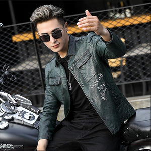 2019 New Men's Genuine Leather Jacket Sheepskin short motorcycle leather coat Dark green lapel slim leather jackets $1,533.00 $3,066.00